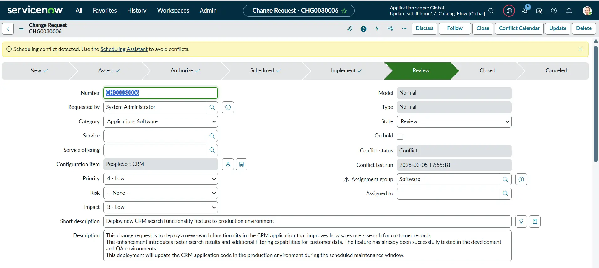 Example: A developer raises a change request to deploy a new search functionality feature in the CRM application to improve how sales teams find customer records.