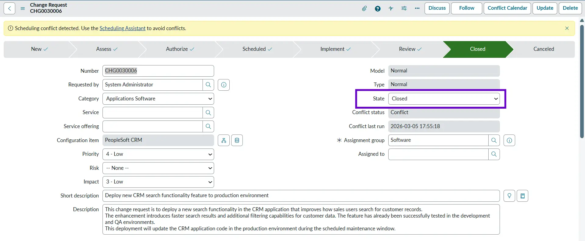 Example: The change record is updated with the implementation results, confirming that the CRM deployment was successful and the new feature is working as expected.