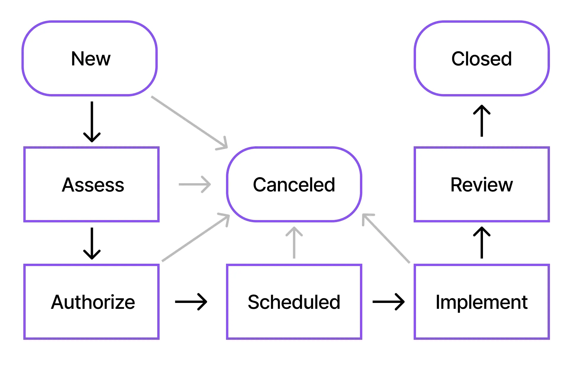 In the Assess state, the change is reviewed to understand its risk, impact, and feasibility. The implementation team does an in-depth review of the change and evaluates if the change might affect other business services or users. By the end of the Assess state, the goal is to have a well‑understood, clearly defined change that can safely progress to the next stage.