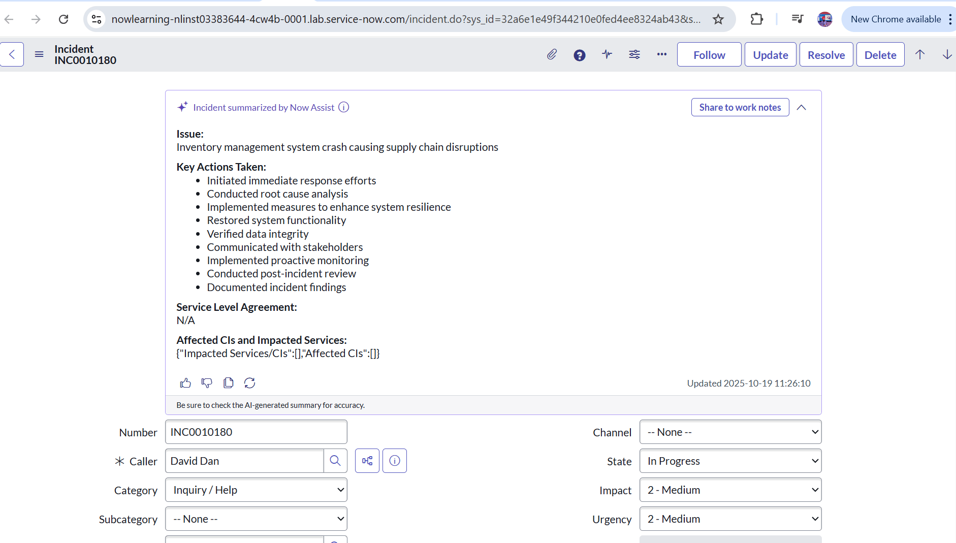 In the following screenshot, Now Assist summarized an Incident based on Short Description and Work Notes.